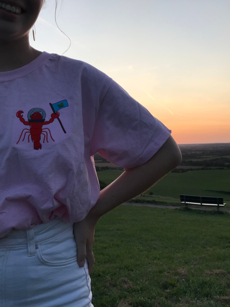 ‘Both of us love tie-dye and it is definitely on trend at the moment. We love the bleach tie-dye that โFuture Selfโ released during lockdown and fell in love with the process when making our graduation hoodies. The lobster design came about because Niamh wanted a lobster t-shirt and could not find one she liked. Even though the collection was space themed, we couldnโt leave him out and the world’s first lobster astronaut was born!